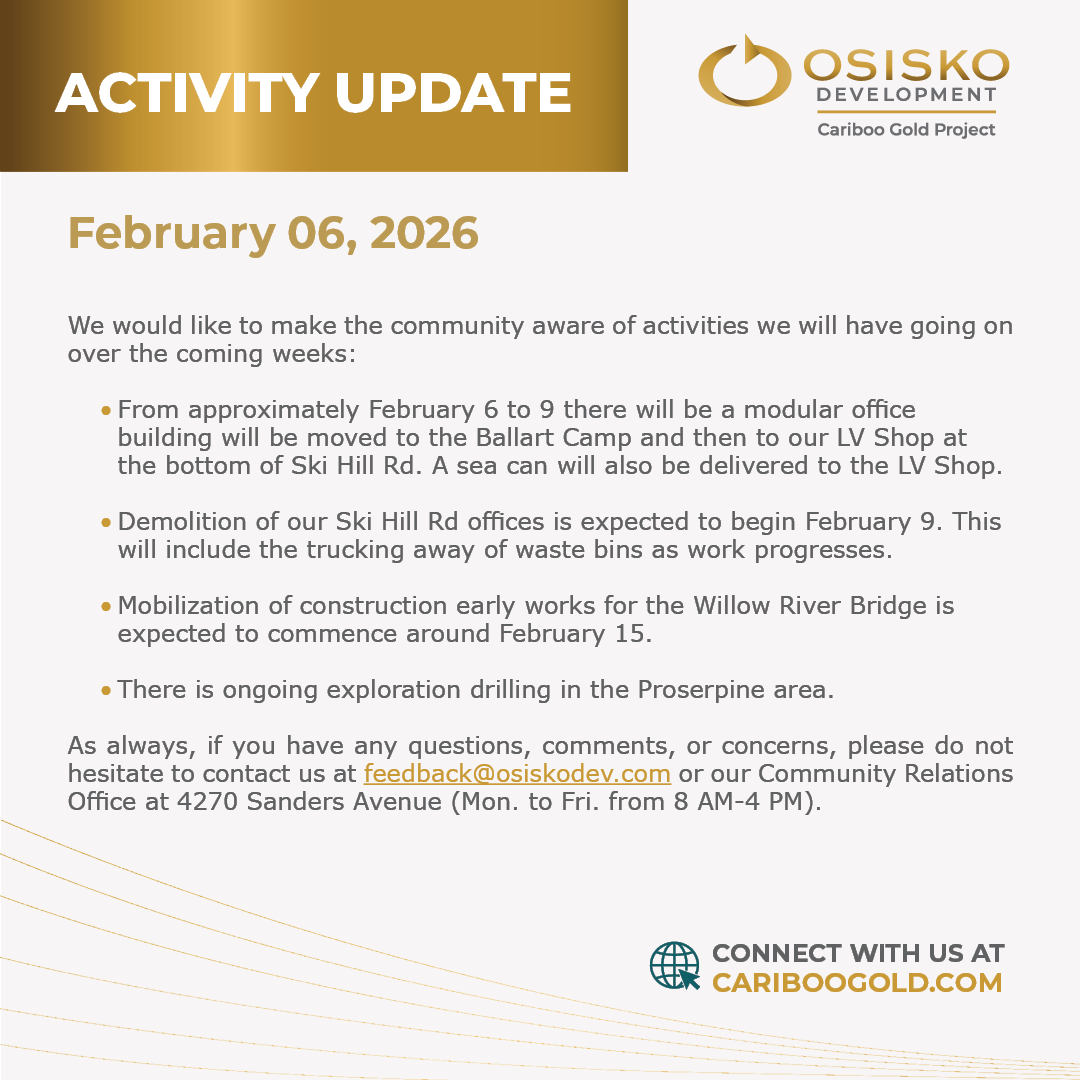 We are excited to share a video animation of the proposed Mine Site Complex for the Cariboo Gold Project! This visualization provides a glimpse into how the site has been thoughtfully designed to integrate with the surrounding environment while prioritizing both community and environmental considerations.